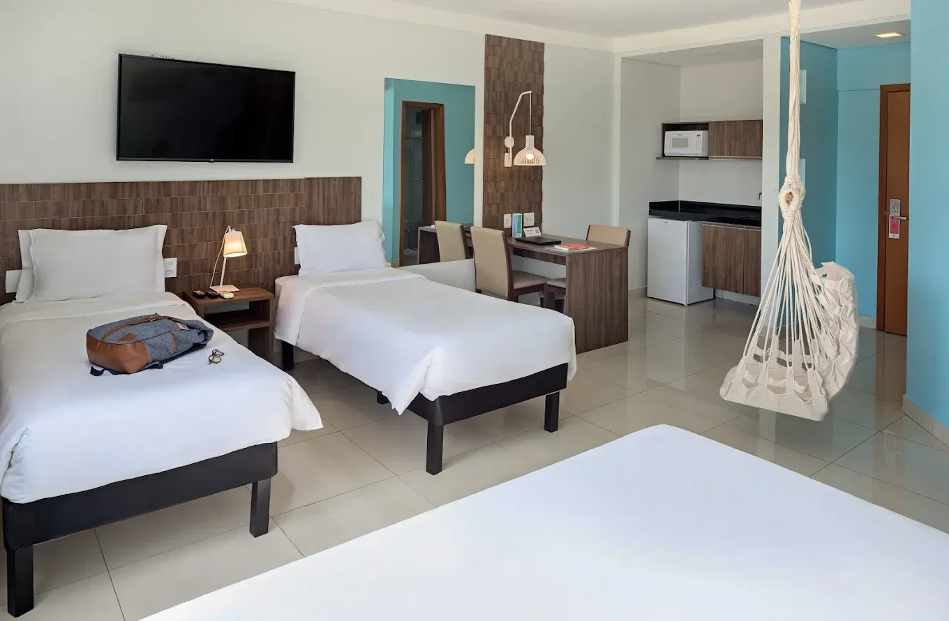 Com quartos confortáveis, climatizados e bem equipados — incluindo opções adaptadas para pessoas com mobilidade reduzida — o hotel oferece uma estrutura completa para quem viaja a trabalho ou lazer. Conta com restaurante, bar 24 horas, piscina ao ar livre, academia, estacionamento e Wi-Fi de alta velocidade em todos os ambientes.